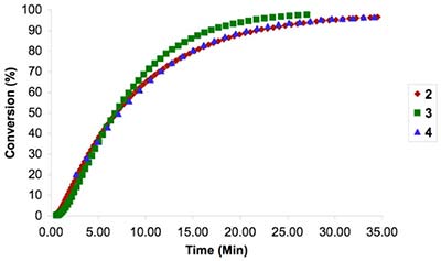 活性炭在CH 2 Cl 2中的活性與其他催化劑在二烯丙基二乙酸二乙酯的RCM反應中進行比較(5)。如圖2所示,PEG鏈與N-雜環碳烯(NHC)的連接不會顯著影響活性炭的活性。