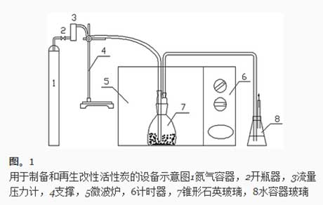 該實驗裝置是一種經(jīng)改良的家用微波爐,其工作頻率為2,540MHz。改變微波爐以將氮引入錐形石英玻璃中。氮氣瓶與流量計連接(圖1)。錐形石英玻璃用作每個實驗的反應器。將制備的改性活性炭在室溫下在氮氣保護下冷卻,并從微波爐中取出,用于下一個實驗。