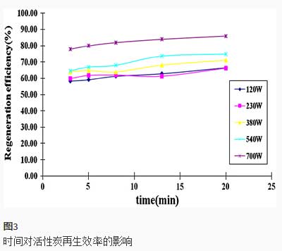 經(jīng)過研究發(fā)現(xiàn)了活性炭再生的最佳條件。在700 W微波照射功率和3 min照射時間下,改性活性炭的再生效率可達98%左右。