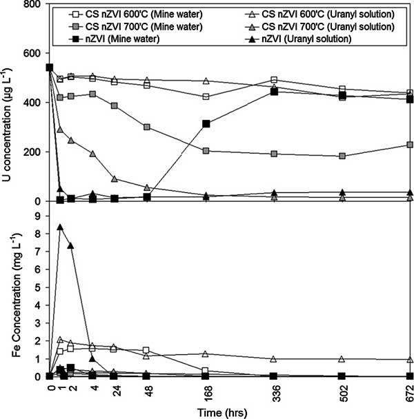 在700℃合成的活性炭記錄的最大鈾除去量低于硼氫化物還原的零價鐵。這部分歸因于Fe 0的質量百分比較低在前者材料中。另外,鈾吸收的動力學記錄為活性炭較慢,表明鈾吸附表面位置的密度較低。盡管如此,在700℃下合成的活性炭記錄了在實驗的后期(> 7天)中較低的鈾解吸。這種差別鈾吸收行為的具體機制仍不清楚。