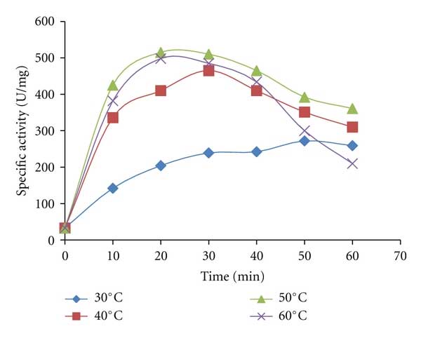 圖2中的結果總結了時間和溫度對活性炭純化淀粉酶的影響。 很明顯,在高溫下通過活性炭純化真菌淀粉酶使真菌淀粉酶的比活性顯著增加。 在50℃下,在20分鐘的駐留時間下獲得520U/mg的最佳比活性。 然而,在溫度超過50℃和超過30分鐘的較長時間用活性炭進行酶處理導致淀粉酶活性降低。顯然,升高的溫度增強了活性炭的蛋白質吸收和脫色能力。 吸收率和吸收能力主要取決于活性炭的表面化學性質,接觸時間和溫度。