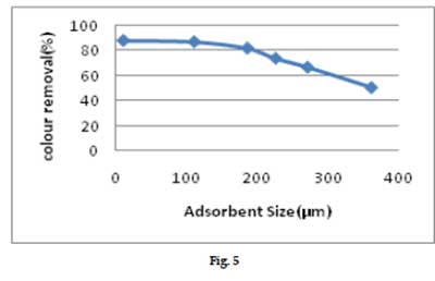 圖5顯示了活性炭顆粒尺寸對(duì)去除顏色的影響。從平臺(tái)上可以看出,對(duì)于固定的活性炭劑量,對(duì)于較小的吸附劑尺寸,顏色的去除率較高。此外,可以看出,隨著活性炭尺寸的幾何平均值的增加,去除百分比降低。這是因?yàn)椋绞潜砻娆F(xiàn)象,較小的粒度提供相對(duì)較大的表面積,因此在平衡時(shí)發(fā)生較高的吸附。顆粒大小的影響為實(shí)現(xiàn)活性炭的最佳利用和填充床吸收器設(shè)計(jì)的穿透曲線的性質(zhì)提供了重要的信息。