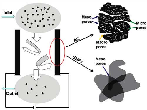 電容去離子技術(shù)采用活性炭和石墨烯納米片(GNFs)電極的機理。在研究人員進行的實驗中,他們將石墨烯納米片基電極與傳統(tǒng)活性炭電極進行了比較。他們指出,“盡管具有較大的表面積(989.54米2 /克)比石墨烯納米薄片(222.01米2 / g)中,活性炭具有僅13.73微摩爾/克,這比石墨烯納米薄片的低得多的electrosorptive容量(其電吸附容量為23.18μmol/ g)“。