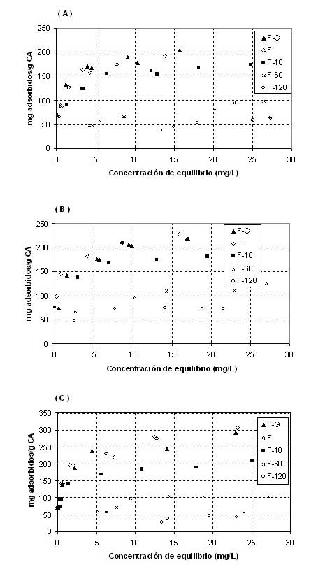 活性炭呈現(xiàn)基本特性pH值PZC接近9. OHBT相對于MeBT和BT的吸附容量的增加可能與芳族體系中電子密度的增加有關(guān)。與甲基相比,羥基增加了芳族體系的電子密度。苯并噻唑分子中羥基和甲基的存在引起B(yǎng)T分子的芳族體系的電子密度增加,增加了原始活性炭的吸附能力。吸附能力的增加與苯并噻唑芳環(huán)的π電子體系和碳石墨平面的電子π能帶之間的分散力的增強有關(guān)。在圖2A,2B和2C分別示出了BT的吸附等溫線,和OHBT MEBT上經(jīng)歷與臭氧預處理10分鐘,(F-10),60分鐘(F-60)120分鐘活性炭(F- 120),并在氮氣流(FG)下在1,000℃下脫氧。