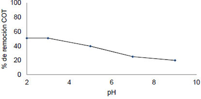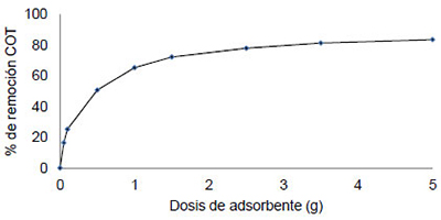 對(duì)于具有官能團(tuán)相關(guān)聯(lián)的吸附現(xiàn)象增加對(duì)應(yīng)于所述頻帶3200-3600cm-1之間的信號(hào)的存在證明(拉伸振動(dòng)相關(guān)聯(lián)OH醇和羧酸),2700-3000cm-1(帶有羧酸和羰基化合物基團(tuán)相關(guān)聯(lián))和在范圍1000至1200cm-1(相關(guān)羰酸基團(tuán))。注意2250-3300cm-1之間相關(guān)聯(lián)的帶的外觀與該鏈接N + -H(離子),用于氨的吸附。在圖3中 顯示了pH對(duì)污染物中TOC吸附的影響。在酸性介質(zhì)(約50%)中獲得最大的去除率。高于pH 3.0觀察到在流出物中去除該污染負(fù)荷的降低。在圖4示出了活性炭劑量對(duì)TOC去除存在于污染物的效果。活性炭的提高劑量增加而增加的污染物去除的水平,但是,在較高濃度情況下不會(huì)增加去除水平,因?yàn)榛钚蕴康奈剿皆谝欢〝?shù)值中達(dá)到了平衡。從所得結(jié)果中,選擇2.5g的活性炭劑量。從這個(gè)數(shù)值來(lái)看,總有機(jī)炭TOC去除率約為80%。