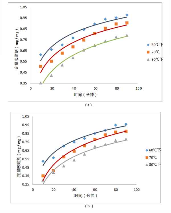 圖2。(a)使用來自棉花的活性炭脫色棉籽油的吸附動力學(b )使用來自棉籽皮的活性炭對棉籽油脫色的吸附動力學。