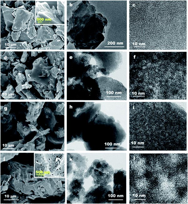 圖1、原煤的SEM和TEM圖像以及通過各種活化程序得到的衍生活性炭。原煤的SEM(a),TEM(b)和HRTEM(c)圖像,SEM(d),TEM(e)和HRTEM(f)活性炭圖像,SEM(g),TEM(h)和HRTEM(i)化學活性炭的圖像;SEM(j),TEM(k)和HRTEM(1)物理活性炭圖像。