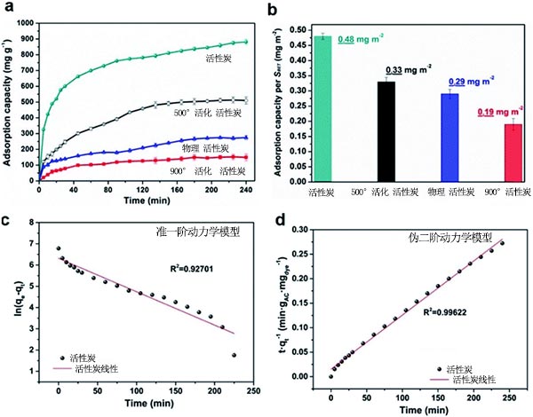 圖2、吸附動力學結果。(a)吸附能力隨時間的變化;(b)典型樣品的BET表面積的標準化吸附容量;(c)活性炭的偽一階動力學擬合;(d)活性炭的偽二階動力學擬合。