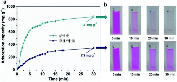 由于縮短吸附時間對于經濟有效的工業操作具有重要意義,我們進一步采用超聲輔助策略來加速RhB吸附并縮短制備的活性炭的飽和時間,這對制備的活性炭的孔結構幾乎沒有影響。超聲輔助下的吸附時間固定為30分鐘。圖3a顯示了在30分活性炭和微孔活性炭作為時間函數的吸附容量,活性炭從中獲得高達839 mg/g-1的高RhB吸附容量。在30分鐘內(飽和容量的99%),而微孔活性炭可以獲得67%的飽和吸附容量(345 mg/g-1)),進一步證明了分級多孔活性炭相對于微孔活性炭的吸附動力學優勢。圖3b進一步說明了這兩種樣品隨時間的上清液的顏色變化,其生動地證明了活性炭相對于微孔活性炭的高速吸附能力。