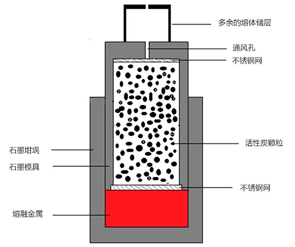 活性炭是性價(jià)比高的碳質(zhì)材料,具有低堆積密度,高比表面積和優(yōu)異的化學(xué)穩(wěn)定性。它廣泛用于水處理,以吸收飲用水中的雜質(zhì)。AZ91鎂合金(9重量%Al,1重量%Zn,0.5重量%Mn,余量Mg)用作金屬?gòu)?fù)合泡沫的基質(zhì)。活性炭復(fù)合泡沫材料的制造,首先將石墨模具填充在四個(gè)單獨(dú)的填料和振動(dòng)步驟中,在每個(gè)步驟中使用等量的活性炭顆粒。這種壓實(shí)方法使整個(gè)樣品高度的密度梯度最小化。在該步驟之后,將不銹鋼網(wǎng)插入模具的開(kāi)口端以將活性炭顆粒保持在適當(dāng)位置。組裝在充滿氬氣的手套箱內(nèi)進(jìn)行,以最小化系統(tǒng)中的氧氣水平。為此,將AZ91合金塊插入石墨坩堝內(nèi),并將填充的石墨模具倒置在坩堝內(nèi)。然后將鋼帽放在模具頂部以在滲透鑄造期間收集過(guò)量的熔體。在下一步中,這些部件位于不銹鋼套管內(nèi)。最后,將組件放入電爐內(nèi)并在660℃的溫度下保持45分鐘,同時(shí)使用保護(hù)性氬氣氛以防止鎂合金在鑄造過(guò)程中氧化燃燒。通過(guò)施加0.02MPa的壓力迫使金屬熔體滲入填充的活性炭顆粒床。在大氣條件下冷卻模具后,手動(dòng)從模具中取出生產(chǎn)的樣品。圖1顯示了使用的設(shè)置的示意圖。